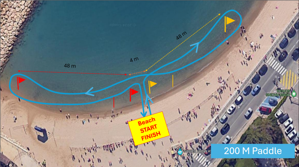 - 200m single paddle in men’s pairs and women’s pairs (2 timed heats): 1-loop circuit starting and finishing on the beach. One men’s team and one women’s team per club.