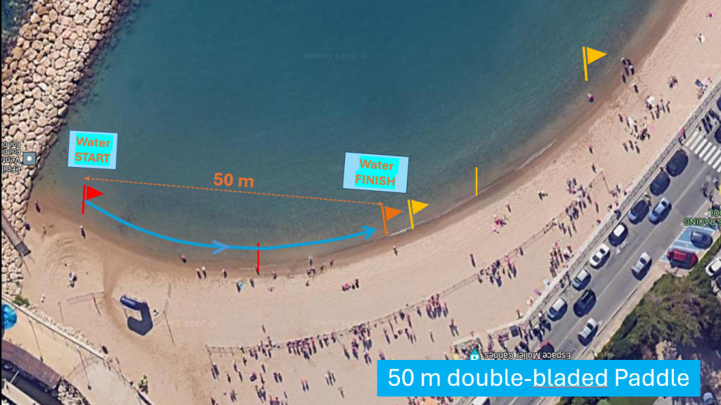 - 50m solo double paddle, men and women: straight circuit starting and finishing in the water (2 timed heats). One man and one woman per club.