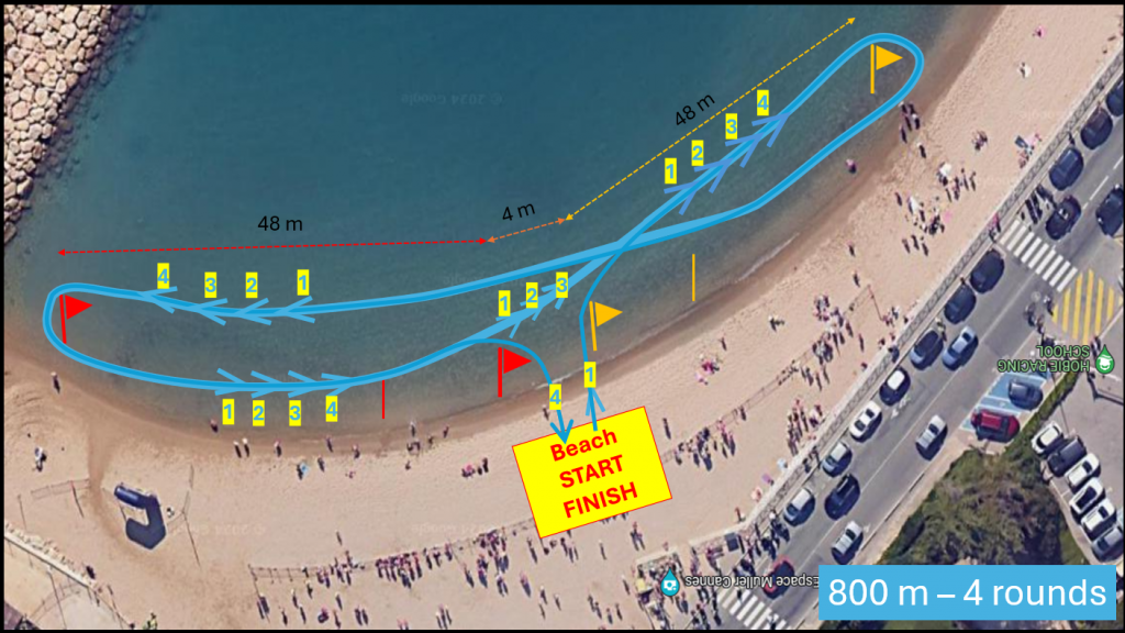 - 800m barehanded in pairs of men and pairs of women (2 timed heats): 4-lap circuit with start and finish on the beach. One men’s team and one women’s team per club.